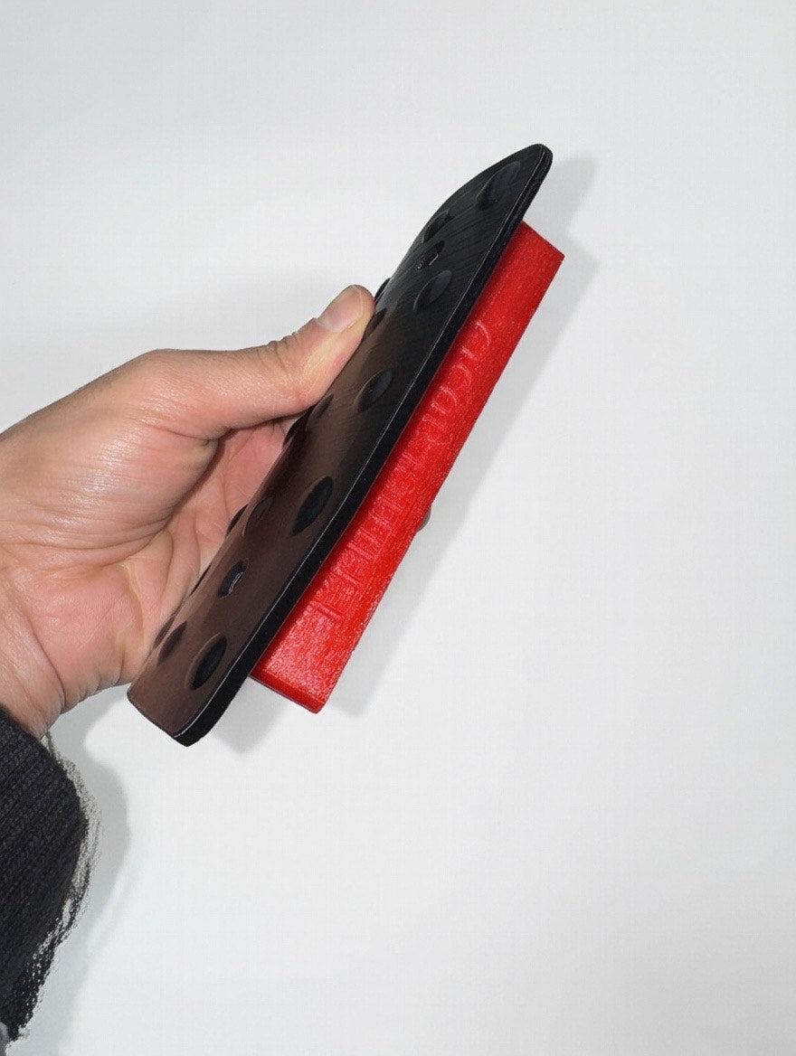 Fixação com os parafusos originais. A parte de cima é feita em PETG preto para maior resistência e acabamento limpo. A parte de baixo é impressa em TPU flexível (mais confortável e com melhor aderência ao pé). A cor da secção em TPU é aleatória — pode sair vermelha, azul, verde, branca, preta ou outras tonalidades dependendo do que estiver carregado — escolho eu aleatoriamente.