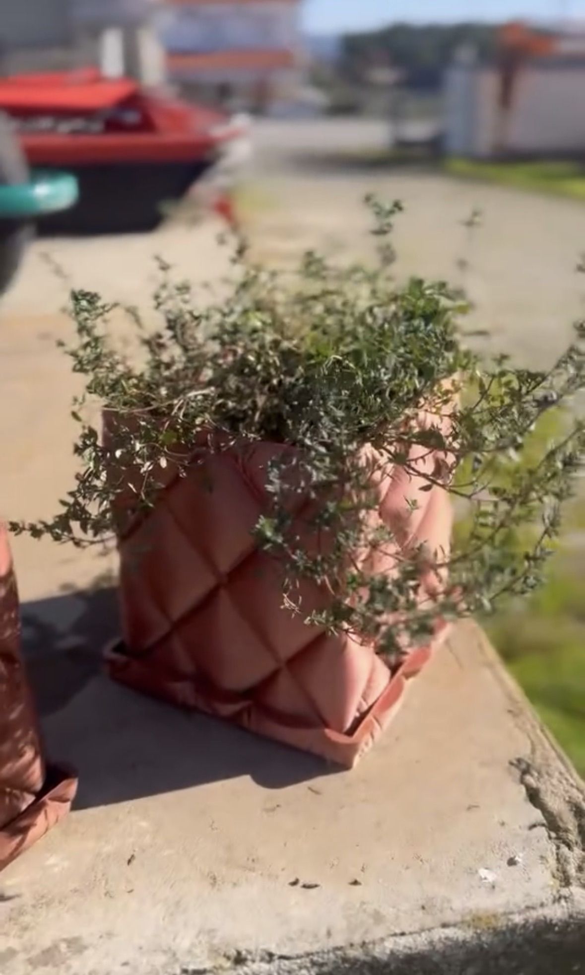 Conjunto de vaso e prato com um design moderno e acolhedor. O vaso tem um padrão almofadado que adiciona um toque de estilo.